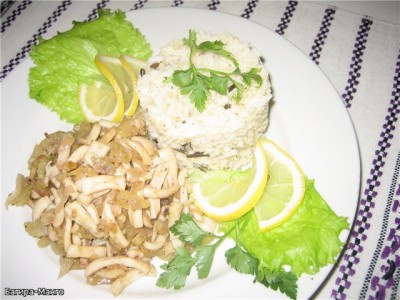 Кальмары промыть, порезать соломкой и проварить в кипятке 2 минуты, затем слить воду. Порезанный сельдерей проварить 1 минуту. Раскалить масло, в него опустить имбирь, лук, жарить до прозрачности. Добавить на сковороду кальмары, сельдерей, соевый соус, водку, перец, жарить еще 5 минут.